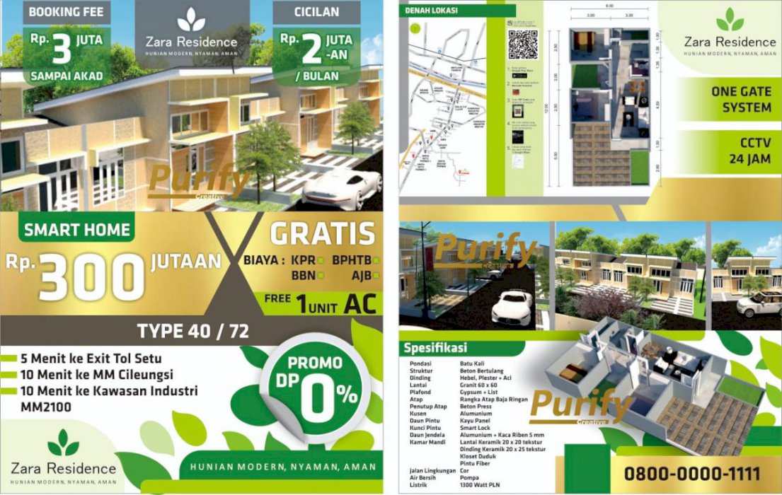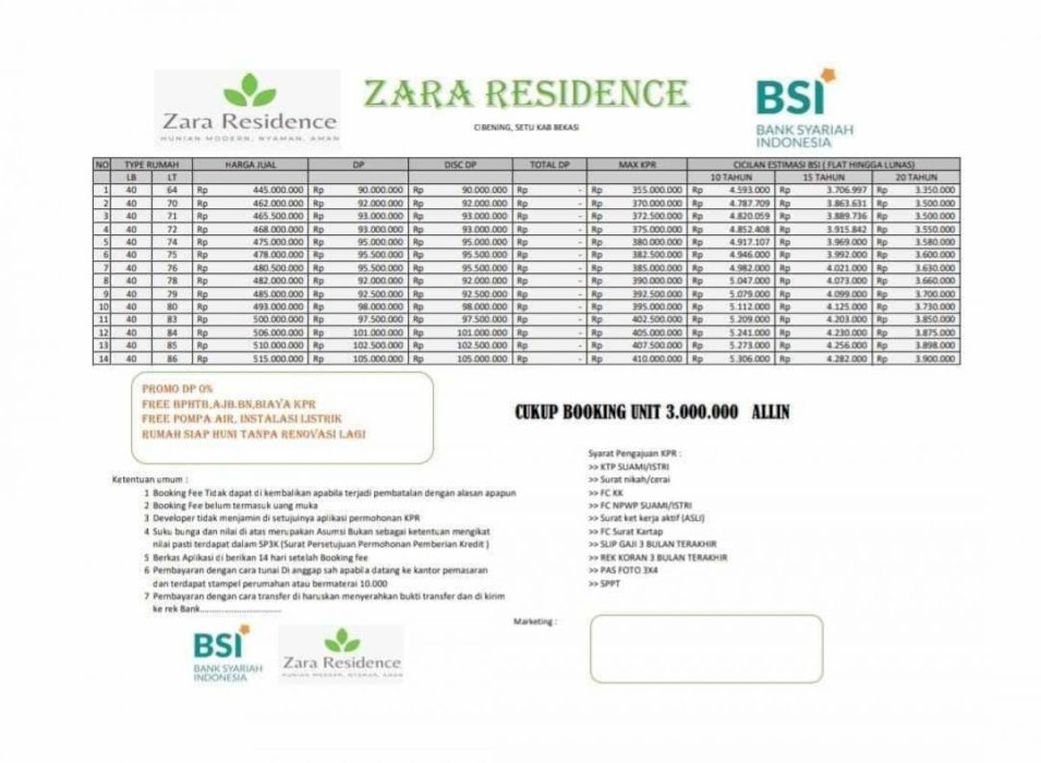 Rumah Cluster Zara Residence Hunian Mewah Asri, Aman dan Nyaman. Hunian konsep Smart Lock dan Security CCTV System dengan Type 40/72. Free DP 0% Cukup dengan Booking 3 juta sampai Akad Kredit. Free 1 unit Ac dan 1 set Pompa semi Jet Pump. Segera miliki Cluster Zara Residence dikelasnya. Persediaan terbatan.